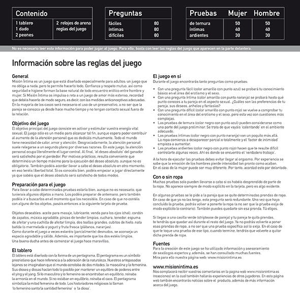 Intimate Mission takes you on a journey of discovery, where the most important thing is to enjoy. Through 480 questions and activities, you and your partner will discover what you like most. The game begins with affectionate and romantic tests, then moving through more intimate activities, to finally reach the most passionate tests in which everything is allowed and nothing is obligatory. In a playful way, barriers are broken and you get closer to each other. The game is captivating, exciting, direct and daring, sometimes hilarious, but without ever losing respect and good taste. In this game there are no obligations and everything can be done to your liking.